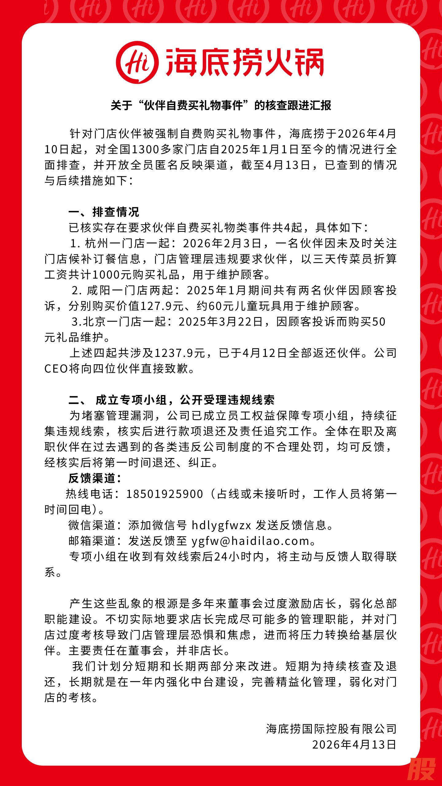 海底捞回应“强制员工自费买礼物”:已核实类似事件4起 公司CEO将向四位伙伴直接致歉海底捞回应“强制员工自费买礼物”:已核实类似事件4起 公司CEO将向四位伙伴直接致歉