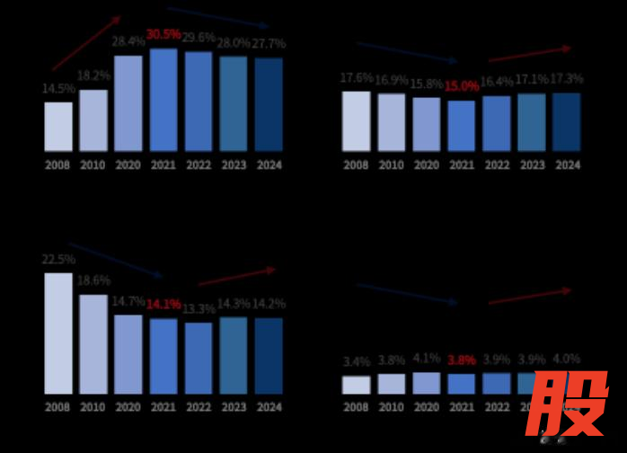 2008-2024年主要国家和地区在全球制造业增加值的比重