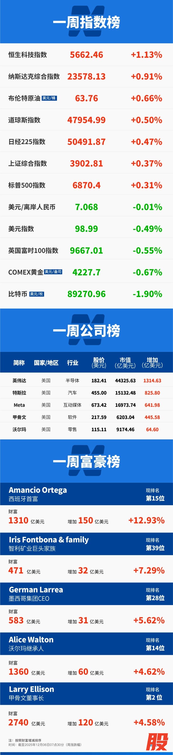 美股科技七巨头方面,Meta本周累涨5.46%,英伟达累涨4.35%,特斯拉涨近7%。此外,甲骨文累涨8.89%。
