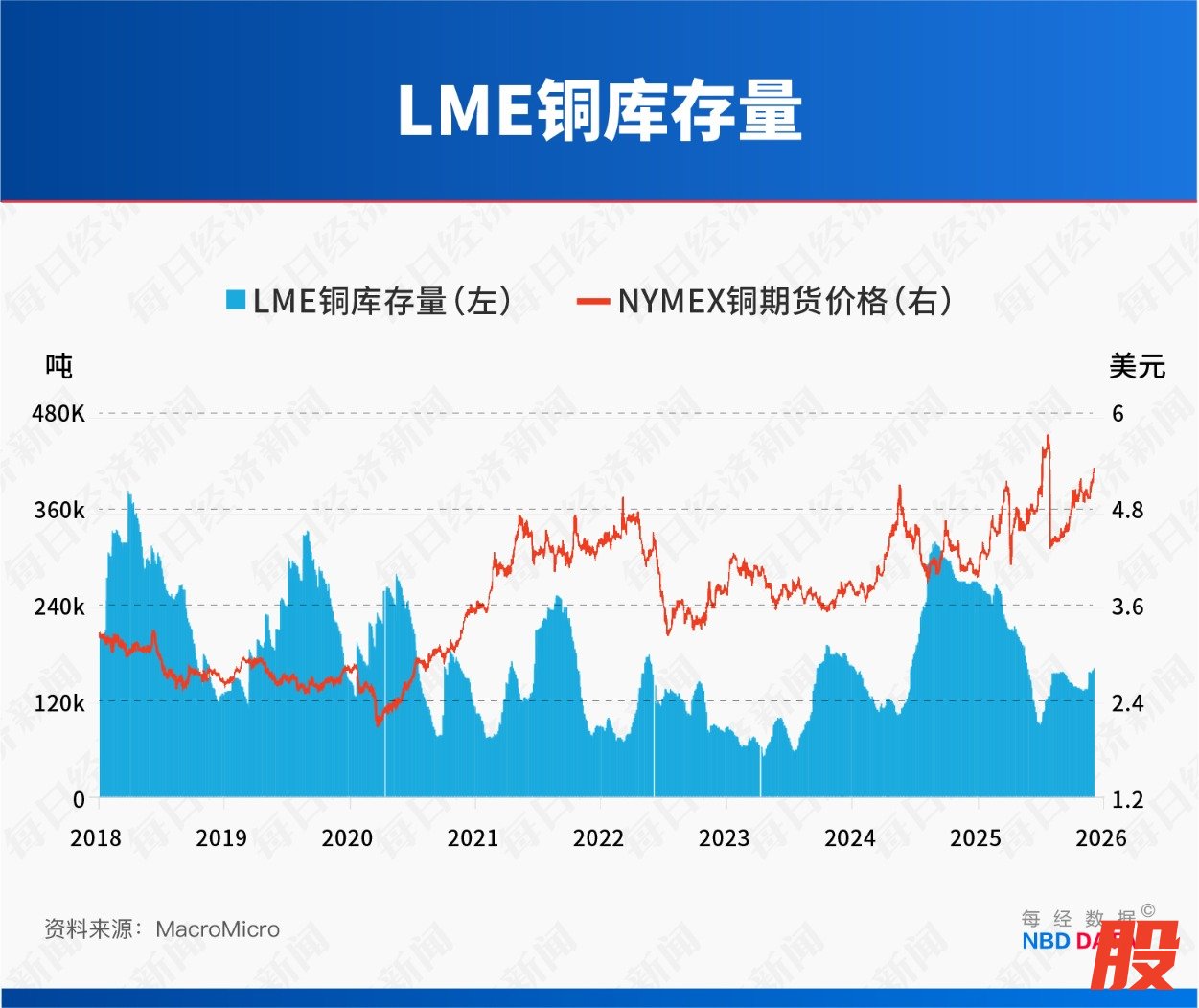 近期,伦敦金属交易所核准仓库中的铜库存已处于历史低位。12月2日,瑞士能源贸易巨头Mercuria能源集团从LME位于亚洲的仓储点注销了超过4万吨的铜库存,货值高达4.6亿美元。